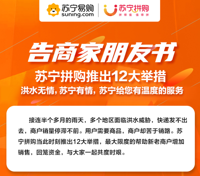 為了更好的幫助全國(guó)受汛情影響的農(nóng)民搶銷農(nóng)產(chǎn)品,蘇寧拼購(gòu)發(fā)布了“戰(zhàn)汛十二條”的具體舉措,分為四大扶助方向:
