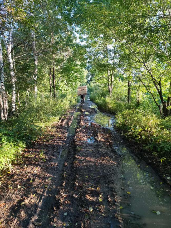 一路開下來(lái),車身濺起不少泥垢??斓侥康牡貢r(shí),一段泥濘的林間小路攔住了王能的去路。原來(lái),道路積水過(guò)多,泥土過(guò)軟,車輛不能前行。王能隨即將車??吭诼愤?,直接卷上褲腿,扛起電視前行。兩公里的林間路,本就不輕松,扛著電視更是“難上加難”。