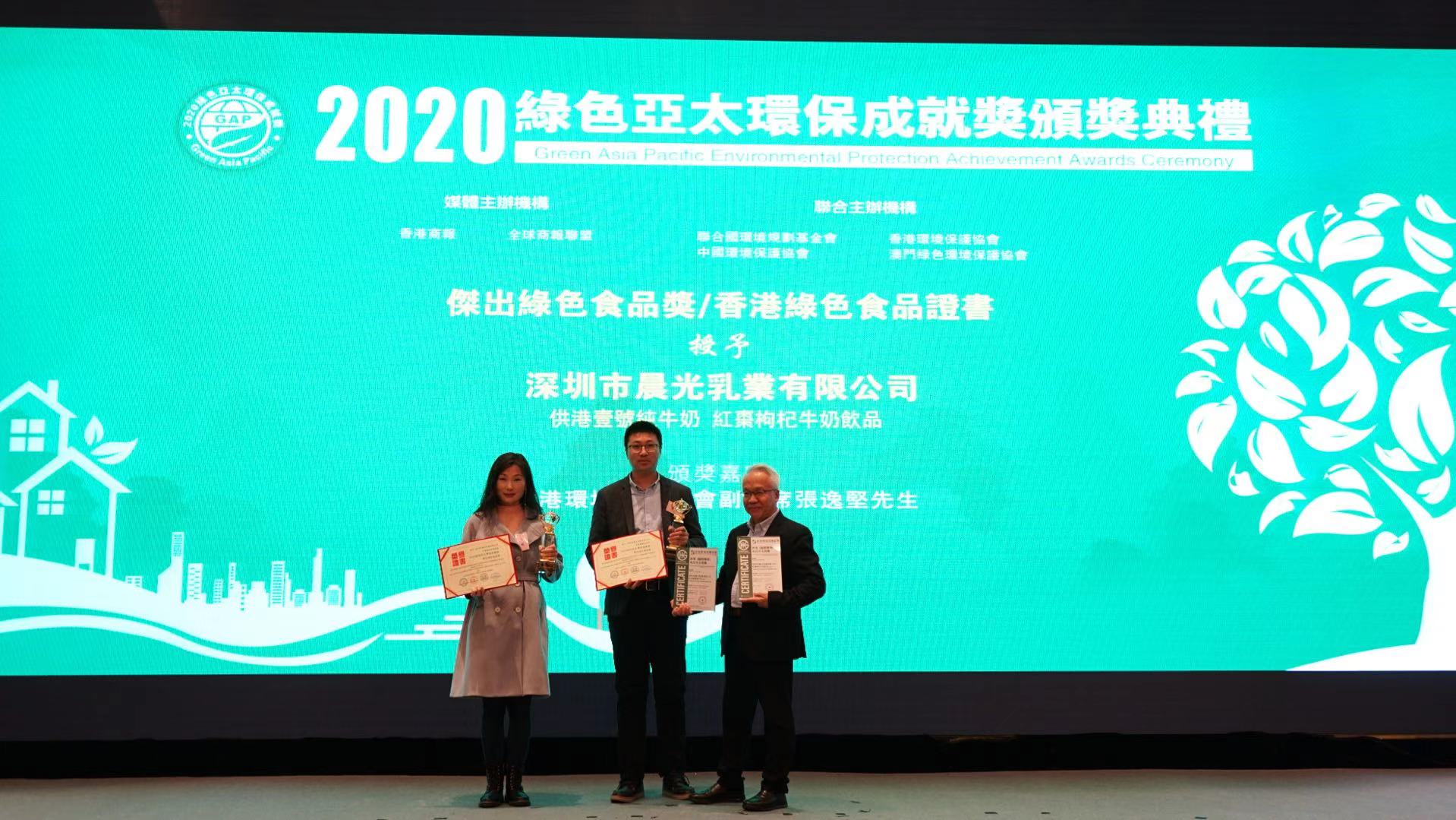 頒獎典禮上,“2020綠色亞太環(huán)保成就獎”之“杰出綠色環(huán)保先行示范區(qū)獎”授予深圳市大鵬新區(qū);“杰出環(huán)境保護企業(yè)獎”有兩家得主,分別授予河南平煤神馬環(huán)保節(jié)能有限公司、惠州市深廣田產(chǎn)業(yè)投資發(fā)展有限公司;“杰出再生能源生產(chǎn)企業(yè)獎”授予廣東亨業(yè)環(huán)??萍加邢薰?;“杰出可持續(xù)發(fā)展工業(yè)園區(qū)”授予中國四角樓國際珠寶創(chuàng)意產(chǎn)業(yè)園;“杰出環(huán)保進步獎”授予深圳市粵環(huán)科檢測技術有限公司研發(fā)的土壤環(huán)境監(jiān)測系統(tǒng);“杰出健康保健產(chǎn)業(yè)貢獻獎”授予深圳騰云健康服務有限公司;“綠色亞太2019環(huán)保成就獎”之“杰出環(huán)保終身成就獎”分別授予孫毅先生、鄭行祥先生;“杰出環(huán)保領軍人物獎”授予白鵬先生;“綠色亞太2019環(huán)保成就獎”之“杰出綠色食品獎”,獲獎產(chǎn)品有3種:通過香港國際檢測中心檢測并獲頒香港(國際標準)食品安全證書的深圳市晨光乳業(yè)有限公司的供港壹號純牛奶、紅棗枸杞牛奶飲品,以及上帝之草康養(yǎng)產(chǎn)品有限公司的上帝之草康養(yǎng)產(chǎn)品系列;該產(chǎn)品系列還獲得“杰出綠色健康創(chuàng)新產(chǎn)品獎”;“綠色亞太2019環(huán)保成就獎”之“杰出綠色低碳產(chǎn)品獎”授予河南平煤神馬環(huán)保節(jié)能有限公司研發(fā)的發(fā)泡陶瓷產(chǎn)品;“杰出健康保健產(chǎn)品獎”授予深圳騰云健康服務有限公司所產(chǎn)的希麗量子冷凝膠;香港特區(qū)政府商務及經(jīng)濟發(fā)展局副局長陳百里博士,在頒獎典禮上的視頻連線致辭中衷心祝賀得獎者。