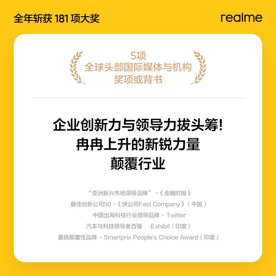 2020年,realme在全球斬獲了17個(gè)企業(yè)和品牌維度的獎(jiǎng)項(xiàng),企業(yè)創(chuàng)新力與領(lǐng)導(dǎo)力獲得業(yè)界認(rèn)可。國際權(quán)威媒體《金融時(shí)報(bào)》肯定了realme在亞太地區(qū)的領(lǐng)先地位。Financial Times、快公司、Twitter、Exhibi等媒體與機(jī)構(gòu)授予realme“亞洲新興市場領(lǐng)導(dǎo)品牌”、“最佳創(chuàng)新公司50”、“中國出海科技行業(yè)領(lǐng)導(dǎo)品牌”、“汽車與科技領(lǐng)導(dǎo)者百強(qiáng)”以及“最具顛覆性品牌”五項(xiàng)大獎(jiǎng)。realme品牌潛力不斷釋放,業(yè)界普遍認(rèn)為,在過去的一年里,realme品牌的增勢強(qiáng)勁,全球品牌價(jià)值在不斷躍升。