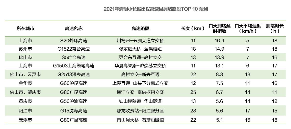 具體時(shí)段方面,預(yù)計(jì)2021年4月2日(清明小長假前一天)15時(shí)開始,全國高速交通壓力逐漸增大,20時(shí)至23時(shí)擁堵程度較高;4月3日(清明小長假第一天)8時(shí)至12時(shí)高速迎來出程擁堵高峰,預(yù)計(jì)10時(shí)至11時(shí)達(dá)峰值,4月5日(清明小長假最后一天)14時(shí)至19時(shí)為高速返程擁堵高峰。