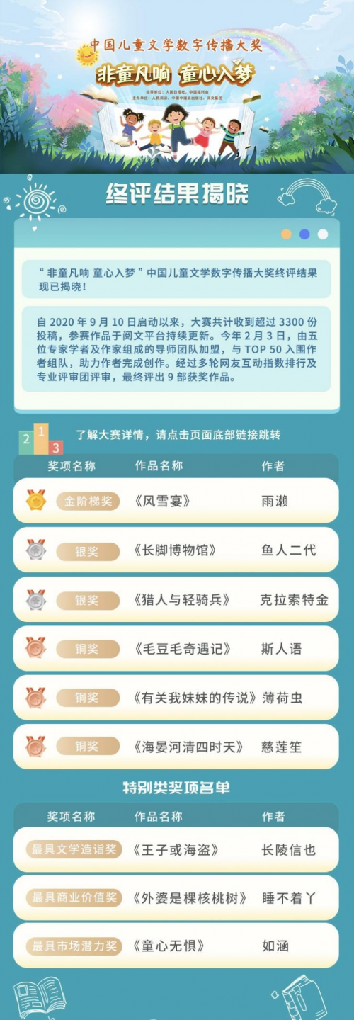深圳新聞網2021年6月1日訊“非童凡響童心入夢”中國兒童文學數字傳播大獎6月1日揭曉終評結果,《風雪宴》等9部參賽作品從3300余部作品中脫穎而出。大獎終評頁面已在人民日報數字傳播有限公司旗下“人民閱讀”平臺、中國中福會出版社、閱文集團等平臺全面上線。