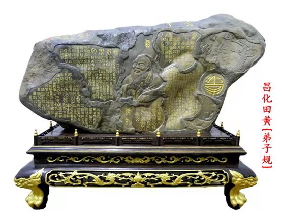 現(xiàn)場所見,該展位展出的一排田黃石中,有兩塊雞血石雕件是錢高潮帶過來的。錢高潮是第二批國家級非物質(zhì)文化遺產(chǎn)項目石雕 (雞血石雕 )代表性傳承人、中國工藝美術(shù)大師、G20杭州峰會國禮設(shè)計制作者。另有一件作品是工藝美術(shù)師鄭先軍雕刻的昌化黑田《弟子規(guī)》,恩師錢高潮親手操刀題跋:“學(xué)無止境,寸草春暉”,激勵學(xué)生刻苦勤勉,牢記師傅“一生擇一事”,為了昌化石雕事業(yè),幾十年如一日的刻苦精神。