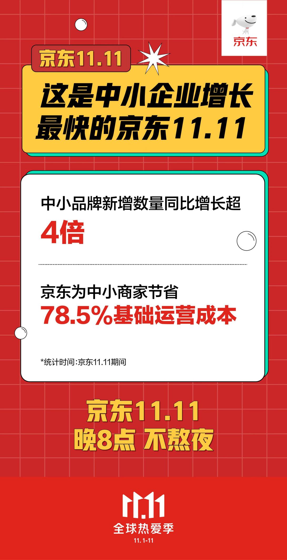 這是中小企業(yè)成長最快的京東11.11,中小品牌新增數(shù)量同比增長超4倍,京東為中小商家節(jié)省78.5%的基礎(chǔ)運營成本。以氣彈茶飲料為主打的“果子熟了”品牌為例,參與京東小魔方新品日的1小時內(nèi),成交額便同比提升500%,訪客數(shù)環(huán)比提升500倍。