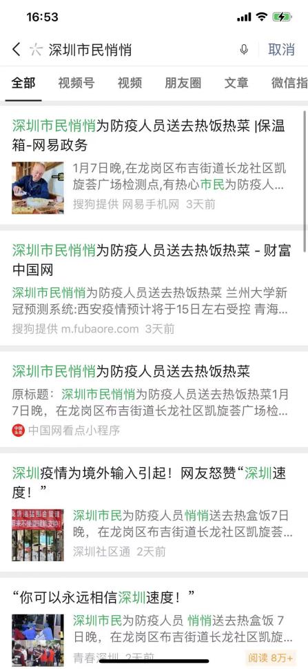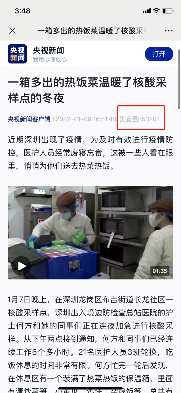 1月9日,一篇名為《一箱多出的熱飯菜溫暖了核酸采樣點(diǎn)的冬夜》的報(bào)道登上了央視新聞。在深圳全民抗疫期間,“維小飯”為核酸檢測醫(yī)護(hù)人員偷偷送上用保溫箱裝好的熱飯熱菜,獲網(wǎng)友紛紛點(diǎn)贊:你永遠(yuǎn)可以相信“深圳速度”,也永遠(yuǎn)可以相信“深圳創(chuàng)新”。央視新聞報(bào)道之后,熱度持續(xù)不減?!吧顝V電第一現(xiàn)場”“羊城晚報(bào)”“光明網(wǎng)”“中國青年網(wǎng)”等權(quán)威媒體也將此事件進(jìn)行了報(bào)道,引發(fā)眾網(wǎng)友熱議。