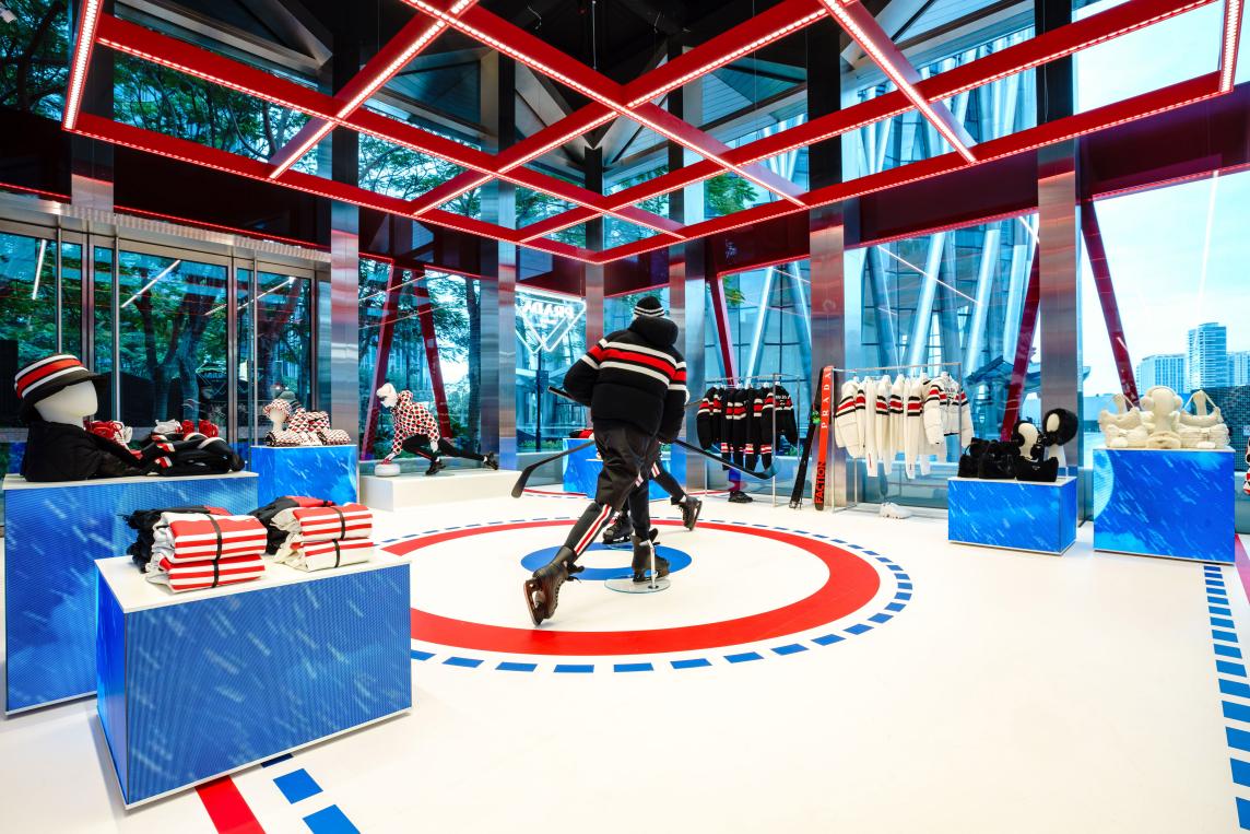 據(jù)了解,全新“冰上普拉達(dá)”限時店在深圳灣萬象城亮相,從冰球場線條得到靈感的活力紅藍(lán)圖案鋪陳于雪白地面,用臺階元素進(jìn)行定義,同時,形似記分牌的紅色 LED燈條滾動顯示Prada徽標(biāo)。體育賽場的看臺搖身變成顧客活動區(qū),雪橇平臺化作展示臺,擺出經(jīng)典運動姿態(tài)的人體模特成為全場焦點。