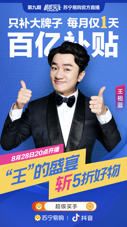明日,王祖藍(lán)將做客蘇寧抖音“超級買手直播間”,所有帶貨商品均來自蘇寧易購。