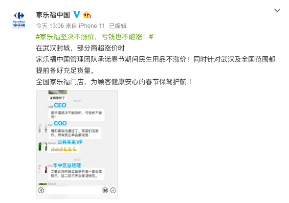 家樂(lè)福中國(guó)官方微博發(fā)布了一條關(guān)于#家樂(lè)福堅(jiān)決不漲價(jià),虧錢也不能漲!#的微博表示,家樂(lè)福中國(guó)管理團(tuán)隊(duì)承諾春節(jié)期間民生用品不漲價(jià)。