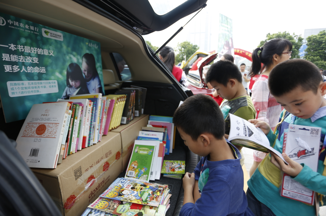 本次活動(dòng)將車(chē)尾箱作為展臺(tái),活動(dòng)參與者按照1:1進(jìn)行舊書(shū)交換,或到深圳農(nóng)行現(xiàn)場(chǎng)設(shè)置的捐書(shū)點(diǎn)捐獻(xiàn)舊書(shū),每捐出五本舊書(shū),可獲得由農(nóng)行送出的10元書(shū)劵?;顒?dòng)吸引來(lái)自錦田小學(xué)、深圳實(shí)驗(yàn)學(xué)校中學(xué)部及深圳新聞網(wǎng)網(wǎng)友共40多個(gè)家庭參與,僅兩個(gè)小時(shí)便交出漂亮的“成績(jī)單”,現(xiàn)場(chǎng)交換圖書(shū)900多本,捐贈(zèng)愛(ài)心書(shū)籍1000余本。