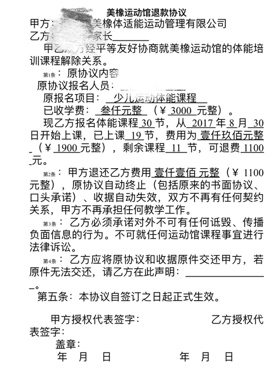 我于2017年8月30日續(xù)報深圳市美橡體適能運動管理有限公司體能課程,已經(jīng)是第三次報了,每次3000元,30節(jié)課,都是與教練微信溝通與轉(zhuǎn)帳。2018年1月10日收到該公司通知說結(jié)束體能館的業(yè)務(wù),不再營業(yè),說統(tǒng)一給我們退剩余的課程費用,12號加了該公司財務(wù)微信溝通相關(guān)退費事宜,財務(wù)說統(tǒng)計好在一周內(nèi)統(tǒng)一給我們退費,19號收到財務(wù)信息,說可以退回1100元,還說幾天后可以退款,并說好通過微信退還(當時壓根沒有說簽協(xié)議后再退),一周拖一周,在23號忽然發(fā)微信來通知說要求去簽協(xié)議才退款,當天又進行了協(xié)商,因為我?guī)z小孩實在抽不出時間去他們公司,能否把協(xié)議發(fā)到我郵箱確認,財務(wù)說先與他老板匯報后第二天給回復(fù),但第二天也沒有收到任何回復(fù),然后又問財務(wù)協(xié)議發(fā)過來了嗎?財務(wù)二話沒說就把協(xié)議通過微信發(fā)給我,當時想想簽了就算了,但細看第三、四條真的很難讓人接受,內(nèi)容詳見附件1。我們交費的時候什么協(xié)議、收據(jù)對方都沒給,現(xiàn)在退錢就要求我們簽協(xié)議,而且是霸王條款,還叫我寫上“我自愿終止培訓(xùn)課程”,老天哪是我自愿的,真是有種迫良為猖的感覺,還有第三條,也太污辱人格了,再次和他們友好協(xié)商希望把協(xié)議第三條改了,對方視而不見,不理不睬,也不積極回應(yīng)。