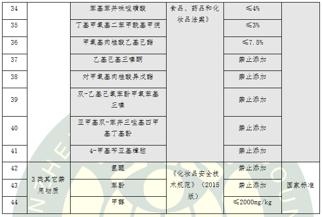 c.防曬劑(15種):苯基苯并咪唑磺酸、二苯酮 -4和二苯酮-5、對氨基苯甲酸、對甲氧基肉桂酸異戊酯、 PABA乙基己酯、丁基甲氧基二苯甲酰基甲烷、奧克立林、甲氧基肉桂酸乙基己酯、水楊酸乙基己酯、胡莫柳酯、乙基己基三嗪酮、亞甲基雙 -苯并三唑基四甲基丁基酚、雙 -乙基己氧苯酚甲氧苯基三嗪、二苯酮 -3、4-甲基芐亞基樟腦