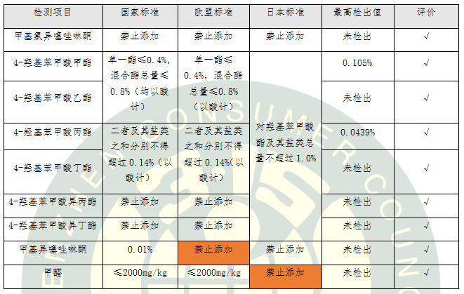 表3.不同國家地區(qū)防腐劑標準要求比對及評價結果