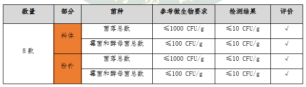 檢測結果顯示:8款氣墊粉底的粉撲和料體的菌落總數(shù)、霉菌和酵母菌總數(shù)檢出量均低于10 CFU/g,遠低于產(chǎn)品微生物的標準要求限值,屬于安全范圍,消費者無需過度擔心。
