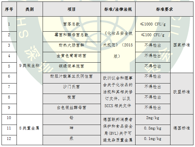 本次比較試驗檢測項目廣泛征求了企業(yè)、業(yè)內專家和第三方檢測機構的意見,不僅依據(jù)了現(xiàn)行國家標準,而且在國標基礎上結合嚴格的歐盟標準 《歐盟化妝品法規(guī)EC1223/2009及其相關修訂文件》、《歐盟消費者安全科學委員會(SCCS)關于化妝品安全的第九版指南》、德國聯(lián)邦消費者保護和食品安全局(BVL)關于可避免雜質重金屬限值的調查報告、美國《聯(lián)邦食品、藥品和化妝品法案》、日本厚生勞動省《藥事法》以及其它相關標準、法規(guī)和技術文件的要求,采用國家標準檢測方法、實驗室通用方法等手段進行檢測,從44項指標展開氣墊粉底安全性品質大比拼,詳細項目與要求見表1。
