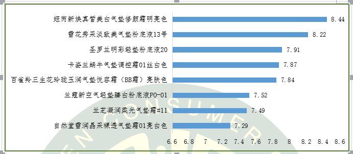 本次感官評價采用行業(yè)通行的測評方法,由9名具有氣墊粉底使用經(jīng)驗,平均年齡在28歲的女性消費者,連續(xù)8天對高度關注的6個性能指標進行了測評,最終得到8個樣品感官評價綜合結果如下:
