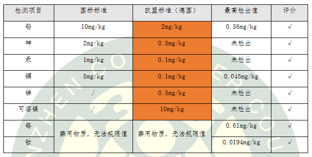 由于配方用料的特殊性,粉底類產(chǎn)品要比普通的面霜和乳液更容易受到重金屬的污染。因此,本次比較試驗不僅檢測國標要求的鉛、砷、汞、鎘,歐盟額外要求的銻和可溶鎳,還檢測了我國和歐盟均禁用的鉻和釹,并且,6種有限量要求的重金屬均按照最嚴格的德國標準進行評價。