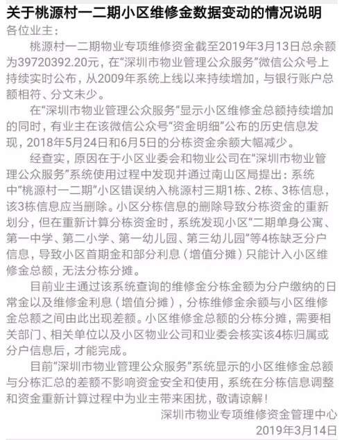 3月18日,南山區(qū)住房和建設(shè)局通過深圳論壇進(jìn)行公開回應(yīng),稱經(jīng)向市物業(yè)專項維修資金管理中心查詢,原因在于桃源村三期1棟、2棟、3棟信息刪除及分棟資金的重新劃分,以致小區(qū)首期維修金和部分利息(增長分?jǐn)偅┲荒苡嬋胄^(qū)維修金總額,無法分棟分?jǐn)偂?/span>