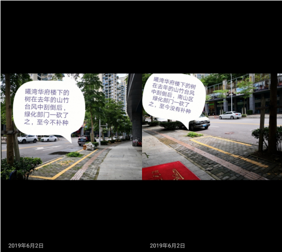 “南山區(qū)城管局當(dāng)時(shí)回應(yīng)道:‘因臺(tái)風(fēng)砍倒的樹木將會(huì)統(tǒng)一采購(gòu),盡快予以補(bǔ)種;有問題的路牌將于七月底前更換。會(huì)盡快聯(lián)系南山稅務(wù)部門,修復(fù)有問題的井蓋’”,該市民卻對(duì)管理部門的工作效率提出質(zhì)疑:“然而現(xiàn)在距離投訴已經(jīng)兩個(gè)月了,問題依然存在。工作效率如此之低?”