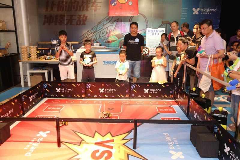 “我跟你說(shuō)噢,那邊吹出來(lái)的泡泡能把我們倆都包進(jìn)去!”“老媽?zhuān)瓉?lái)空氣的形狀是圓環(huán)形的呀……”歡聲笑語(yǔ)中,十幾項(xiàng)科技趣味項(xiàng)目讓小朋友們眼花繚亂、目不暇接,這其中,機(jī)器人對(duì)抗賽無(wú)疑是人氣最高的。賽場(chǎng)上,小朋友們分為紅藍(lán)兩隊(duì),手持遙控器在兩側(cè)站好?!靶∨笥褌冏⒁饫?,每一位機(jī)器人身上有一個(gè)藍(lán)色燈柱,碰撞擋板被撞到后,燈柱長(zhǎng)度會(huì)縮短……”老師一邊在“戰(zhàn)場(chǎng)”中擺放機(jī)器人,一邊為孩子們?cè)敿?xì)講解規(guī)則。一聲哨響,紅藍(lán)兩隊(duì)的“機(jī)器人大戰(zhàn)”拉開(kāi)了帷幕,孩子們操控著自己的戰(zhàn)車(chē),左右閃躲,時(shí)而用一個(gè)漂亮的側(cè)移甩掉追擊者,時(shí)而全力沖擊消耗對(duì)方的“藍(lán)條”。賽場(chǎng)邊的家長(zhǎng)們似乎比小選手更為緊張,他們時(shí)不時(shí)俯下身子,為孩子們出謀劃策:“小超你看,邊上那個(gè)三號(hào)車(chē)藍(lán)條快沒(méi)了,快趕過(guò)去補(bǔ)一下!”一位父親看到了打破僵局的好機(jī)會(huì),急忙提醒道,小朋友則心領(lǐng)神會(huì),熟練的操縱著機(jī)器人貼了上去……經(jīng)過(guò)一番努力,在成功拿下這寶貴的一分后,小朋友回頭與自己的老爸相視一笑,父子二人之間的默契,在這一刻體現(xiàn)的淋漓盡致。