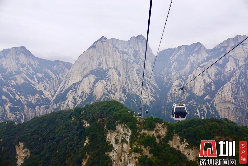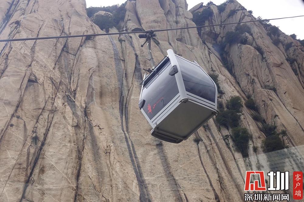 華山西峰的太華索道是迄今為止世界上第一條采取崖壁開鑿硐室站房、兩上兩下的起伏式走向、設(shè)中間站的單線循環(huán)脫掛式索道,總計(jì)投資5億余元建設(shè)。李酮攝。