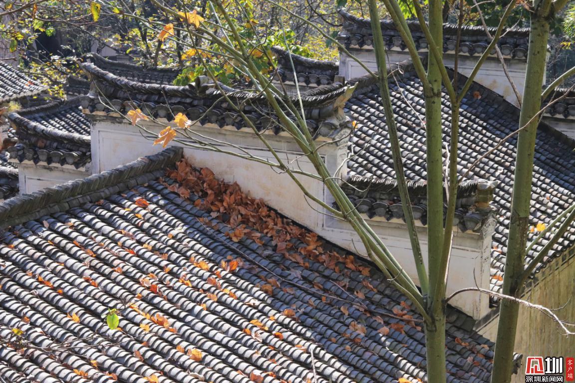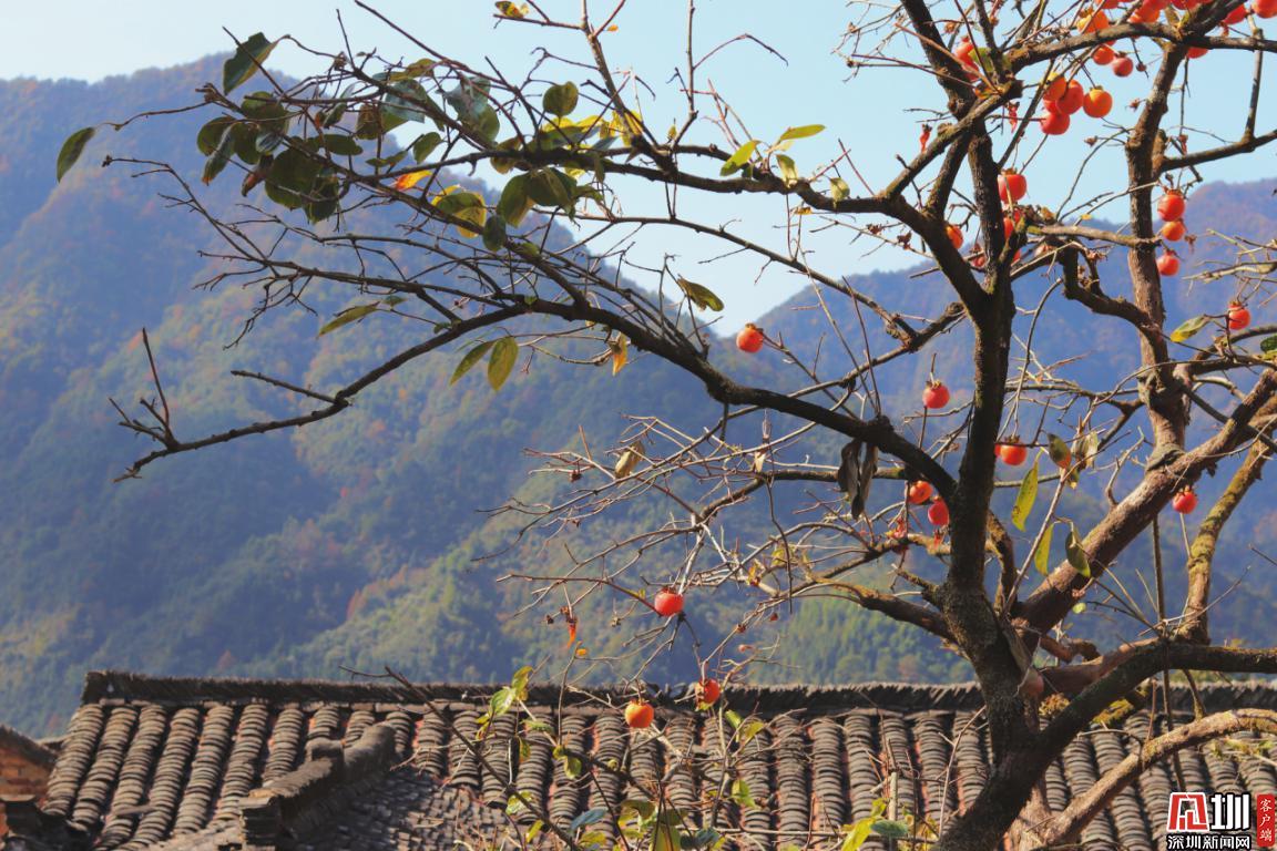 柿子熟透了,齊齊整整地掛在枝丫上,與灰瓦白墻相得益彰。