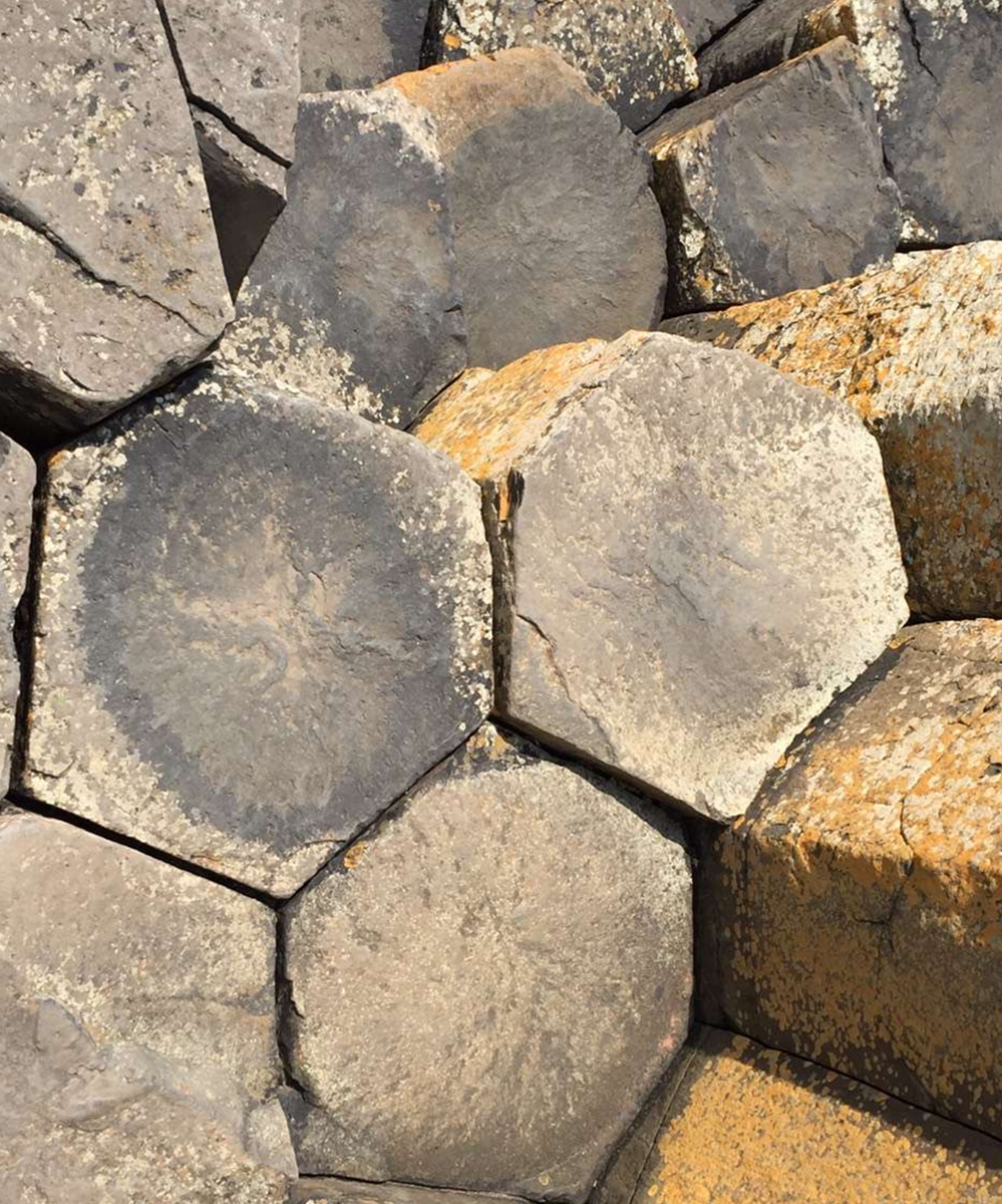 約五千萬年前,在今天蘇格蘭西部內(nèi)赫布里底群島一線至北愛爾蘭東部火山非?;钴S,一股股玄武巖巖熔流從裂隙的地殼中涌出,隨著灼熱的熔巖冷卻收縮,結(jié)晶的時候,開始爆裂呈規(guī)則的六邊形形態(tài)。李仁奇 攝