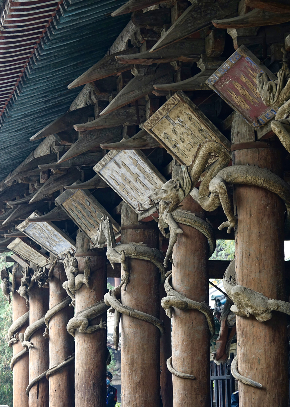 圣母殿前柱上的八條木雕盤(pán)龍。李仁奇 攝