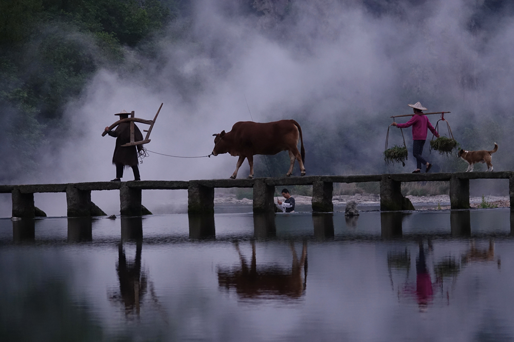 一對(duì)老夫妻一前一后,你牽著黃牛我挑著擔(dān),還自帶云霧繚繞的背景,多么美麗的畫(huà)面。李仁奇 攝
