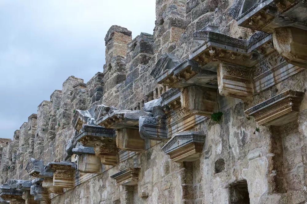 舞臺的墻壁上裝飾著古希臘式樣的圓柱,細節(jié)精美,雕工考究。據(jù)考證,舞臺上方還曾經覆蓋著屋頂,可惜已經損毀。李仁奇 攝