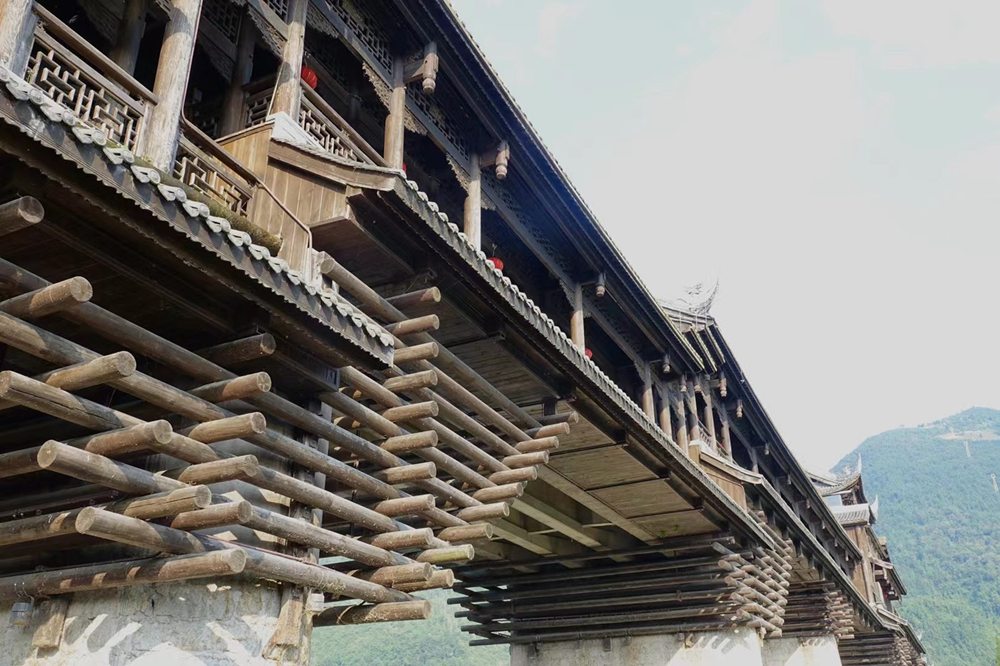 濯水廊橋長(zhǎng)658米、寬5米,分為橋、塔、亭三部分,橋身為純木結(jié)構(gòu),建筑材料之間以榫頭卯眼互相穿插銜接,直套斜穿,牢固精密。李仁奇 攝