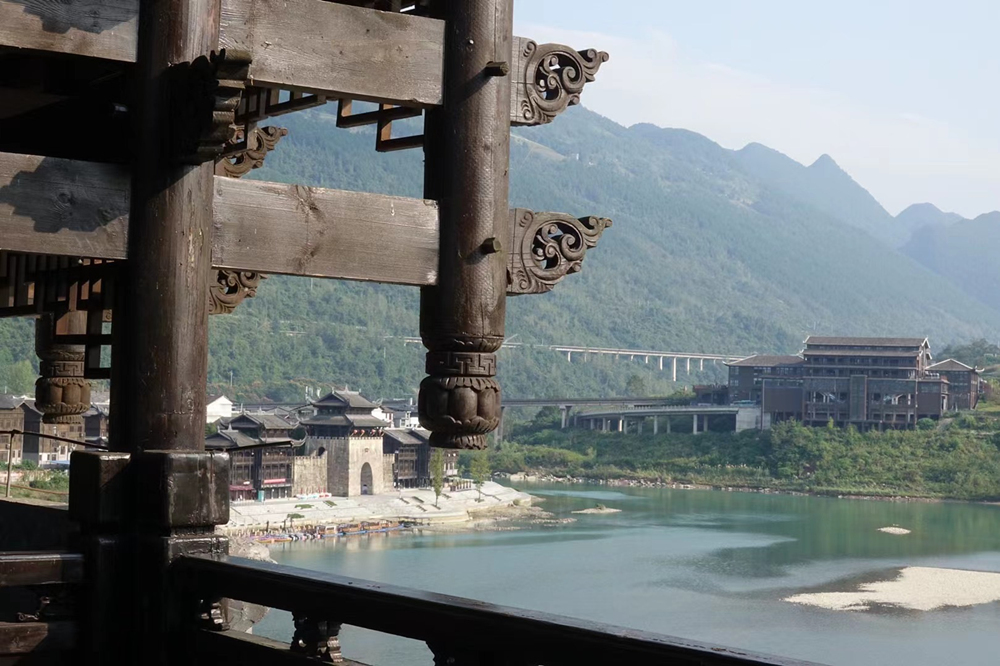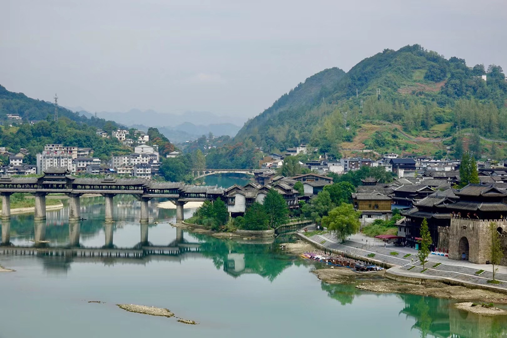 橫跨于濯水古鎮(zhèn)阿蓬江上的超長(zhǎng)廊橋有“世界第一風(fēng)雨廊橋”之稱。李仁奇 攝