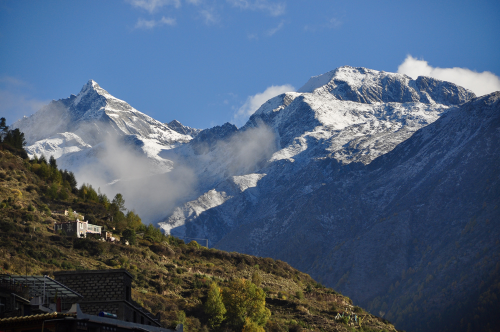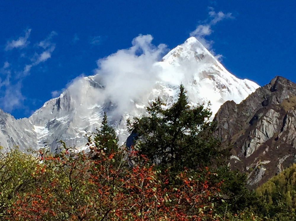四座山峰長(zhǎng)年冰雪覆蓋,因幺妹身材最為苗條,經(jīng)常云遮霧繞,最難窺得全貌,素有“蜀山之后”、“東方的阿爾卑斯”之稱,與“蜀山之王”貢嘎山遙遙相望。李仁奇 攝