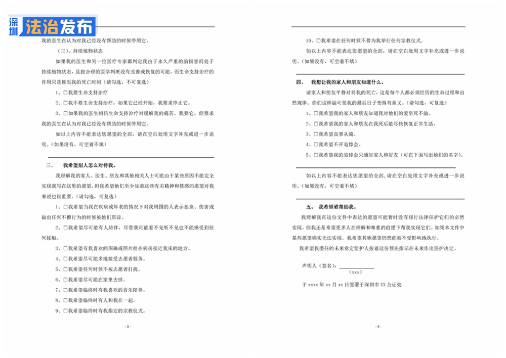 除了生前預囑的3種情況外,杜芹律師公證的這份聲明書,包含5個愿望清單①我要或不要什么醫(yī)療服務②我希望使用或者不使用生命支持治療③我希望別人怎么對待我④我想讓我的家人和朋友知道什么⑤我希望誰幫助我。