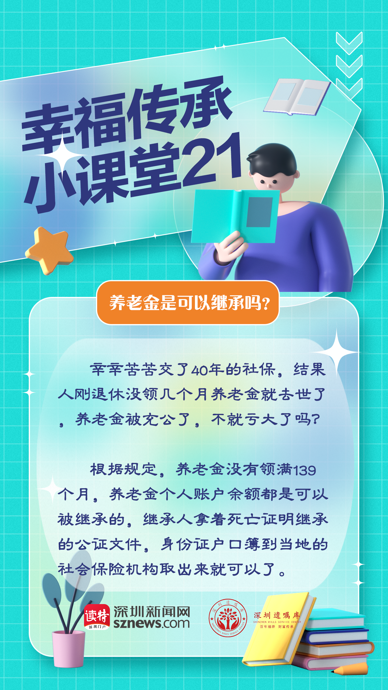 深圳遺囑庫與深圳新聞網(wǎng)聯(lián)合制作的幸福傳承小課堂第21期,我們來聊聊養(yǎng)老金繼承問題。根據(jù)規(guī)定,養(yǎng)老金沒有領(lǐng)滿139個月,養(yǎng)老金個人賬戶余額都是可以被繼承的。繼承人拿著死亡證明繼承的公證文件,身份證戶口簿到當(dāng)?shù)氐纳鐣kU機(jī)構(gòu)取出來就可以了。