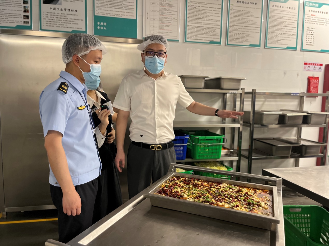 執(zhí)法人員現(xiàn)場對學(xué)校后廚進行詳細檢查,分別從采購索證索票、進貨查驗、制作加工、備餐配送、場所和設(shè)施清潔維護、餐飲具清洗消毒、從業(yè)人員健康管理,制止餐飲浪費,食品安全總監(jiān)配置履職情況,以及落實主體責(zé)任的“日管控周排查月調(diào)度”制度等方面進行詳細檢查。經(jīng)檢查,整體情況良好,但存在部分細節(jié)問題,如水產(chǎn)品刀具分類可更細致、操作臺積水需清理、面點間的食材存放需避免陽光直射等,針對檢查過程中發(fā)現(xiàn)的問題,執(zhí)法人員現(xiàn)場責(zé)令學(xué)校限期整改到位。同時,快檢工作人員對餐廳使用的食材進行了抽檢,結(jié)果均為陰性。