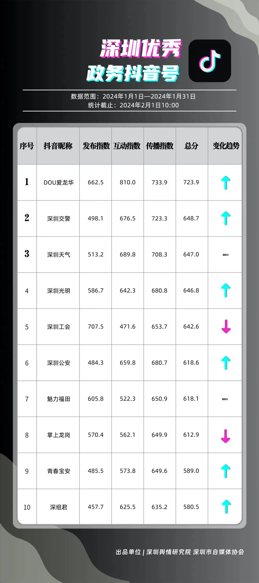 深圳新聞網(wǎng)2月9日訊(記者 陳曉君 實(shí)習(xí)生 張馳)2月8日,深圳輿情研究院、深圳市自媒體協(xié)會(huì)聯(lián)合推出《深圳優(yōu)秀政務(wù)新媒體矩陣》(2024年1月期),市衛(wèi)生健康委、市氣象局、福田區(qū)、光明區(qū)、龍崗區(qū)、龍華區(qū)、市公安局、市應(yīng)急管理局、市交通警察局、羅湖區(qū)的新媒體矩陣獲評(píng)“深圳優(yōu)秀政務(wù)新媒體矩陣”。這些矩陣在內(nèi)容發(fā)布、受眾互動(dòng)和信息傳播方面取得了較好成績(jī),并在深圳政務(wù)新媒體規(guī)范有序發(fā)展進(jìn)程中發(fā)揮著積極作用。