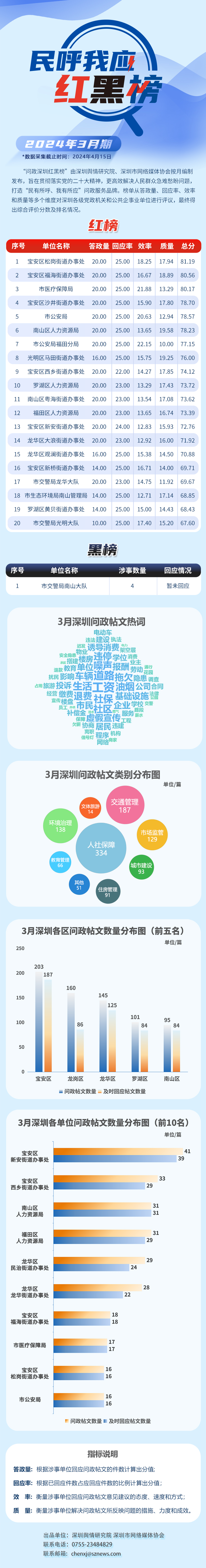 2024年3月,共有20家單位因積極開展網(wǎng)絡答政工作,贏得群眾的支持與認可,最終登上“紅榜”,它們分別是:寶安區(qū)松崗街道辦事處、寶安區(qū)福海街道辦事處、市醫(yī)療保障局、寶安區(qū)沙井街道辦事處、市公安局、南山區(qū)人力資源局、市公安局福田分局、光明區(qū)馬田街道辦事處、寶安區(qū)西鄉(xiāng)街道辦事處、羅湖區(qū)人力資源局、南山區(qū)粵海街道辦事處、福田區(qū)人力資源局、寶安區(qū)新安街道辦事處、龍華區(qū)大浪街道辦事處、龍華區(qū)觀瀾街道辦事處、寶安區(qū)新橋街道辦事處、市交警局龍華大隊、市生態(tài)環(huán)境局南山管理局、羅湖區(qū)黃貝街道辦事處、市交警局光明大隊。另外,市交警局南山大隊因相關帖文回應率偏低,整體答政效果不佳,被列入了“黑榜”。