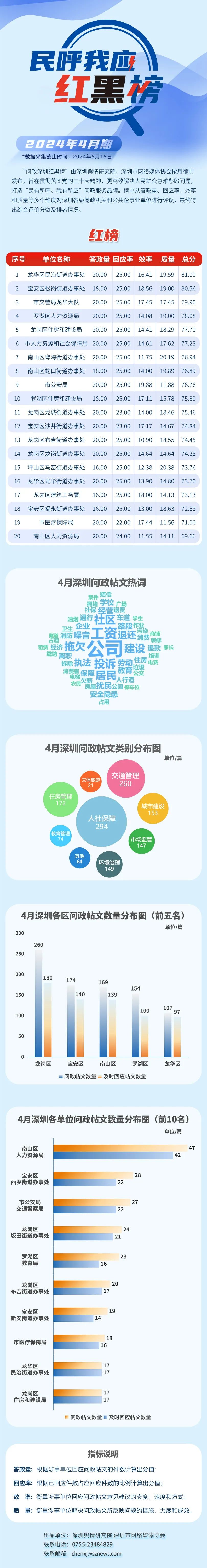 “深圳民呼我應(yīng)紅黑榜”由深圳輿情研究院、深圳市網(wǎng)絡(luò)媒體協(xié)會(huì)按月編制發(fā)布,旨在貫徹落實(shí)黨的二十大精神,更高效解決人民群眾急難愁盼問題,打造“民有所呼、我有所應(yīng)”問政服務(wù)品牌。榜單從答政量、回應(yīng)率、效率和質(zhì)量等多個(gè)維度對(duì)深圳各級(jí)黨政機(jī)關(guān)和公共企事業(yè)單位進(jìn)行評(píng)議,最終得出綜合評(píng)價(jià)分?jǐn)?shù)及排名情況。