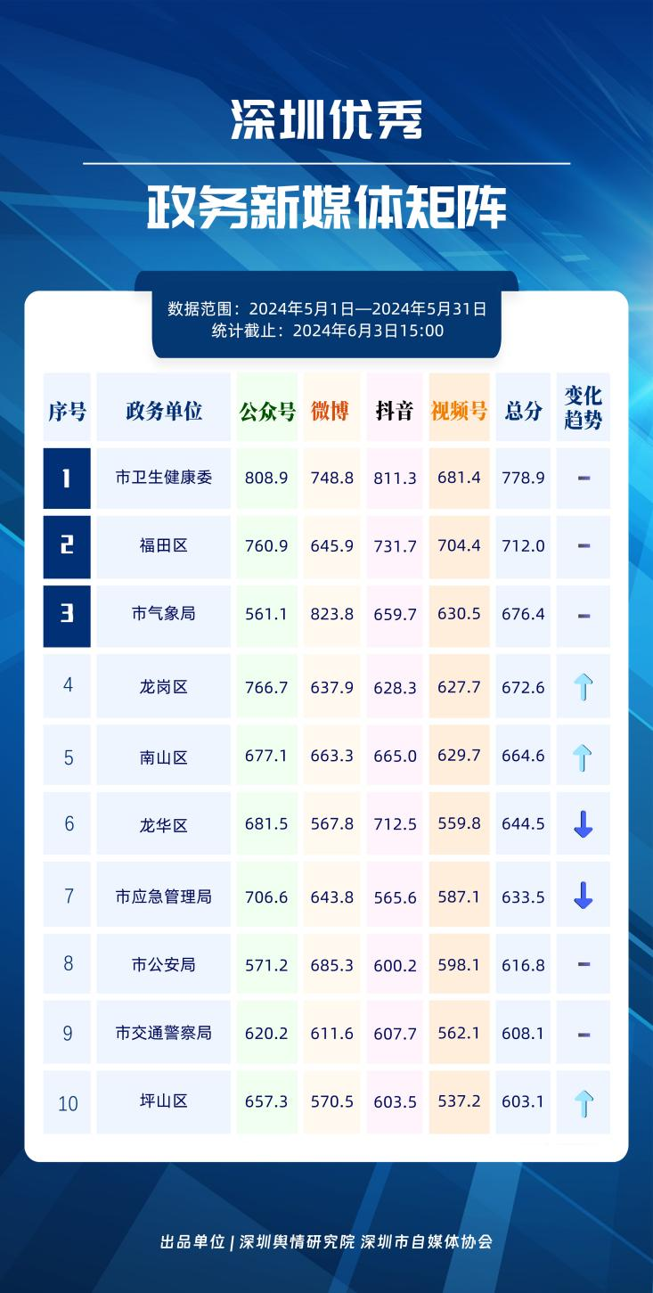 榜單在持續(xù)展示深圳政務(wù)新媒體矩陣建設(shè)成效的同時(shí),梳理總結(jié)了深圳政務(wù)微信公眾號(hào)、微信視頻號(hào)、微博號(hào)、抖音號(hào)、頭條號(hào)的運(yùn)營(yíng)方法與經(jīng)驗(yàn),是政務(wù)公開、回應(yīng)群眾關(guān)切的重要載體。5月,哪些政務(wù)新媒體在本期深受好評(píng),榮登榜單?《深圳優(yōu)秀政務(wù)新媒體矩陣》(2024年5月期)邀您共同關(guān)注。
