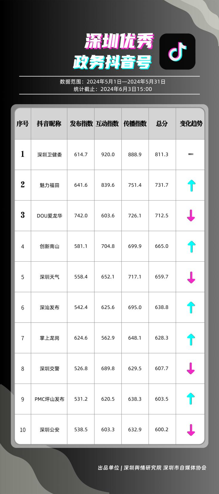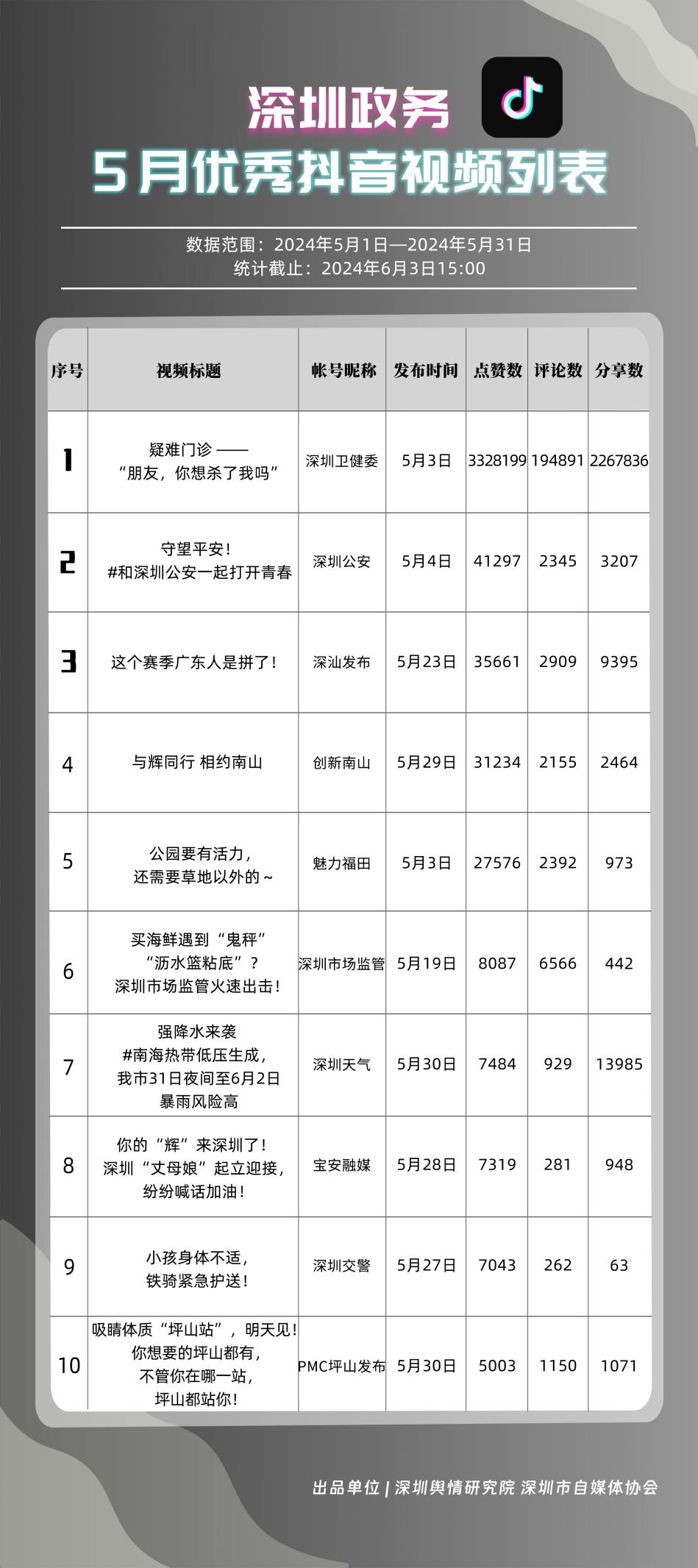 5月,共有10個(gè)政務(wù)抖音號(hào)獲得“深圳優(yōu)秀政務(wù)抖音號(hào)”稱號(hào),分別是“深圳衛(wèi)健委”“魅力福田”“DOU愛龍華”“創(chuàng)新南山”“深圳天氣”“深汕發(fā)布”“掌上龍崗”“深圳交警”“PMC坪山發(fā)布”和“深圳公安”,多個(gè)政務(wù)抖音號(hào)能夠把握短視頻平臺(tái)宣傳要領(lǐng),持續(xù)發(fā)布優(yōu)質(zhì)信息內(nèi)容,做到了政務(wù)便民化、政務(wù)信息傳播高效化,為政務(wù)信息發(fā)布模式開創(chuàng)新渠道樹立了良好典范。