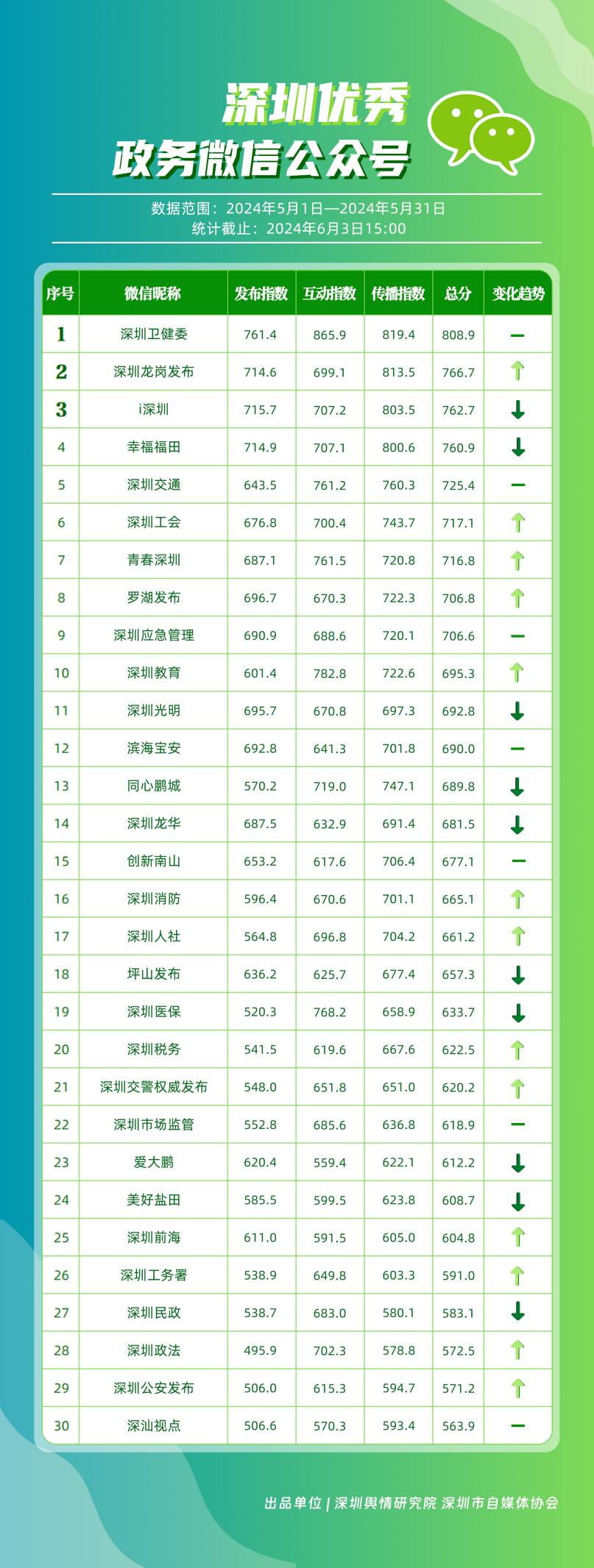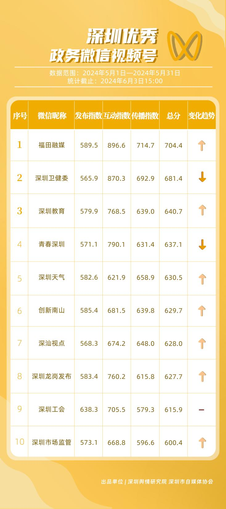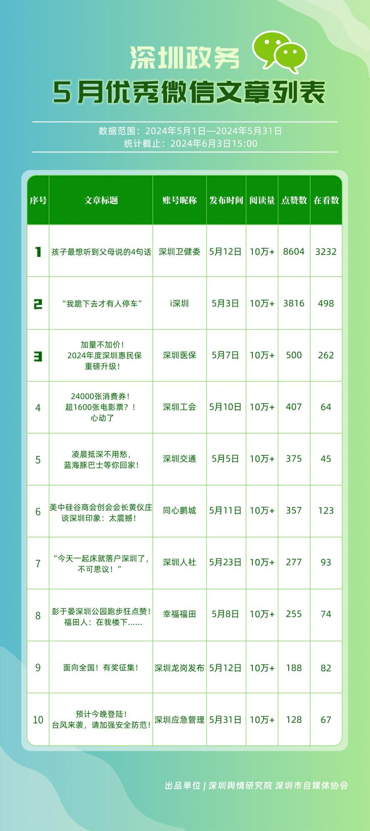 5月,“深圳衛(wèi)健委”“深圳龍崗發(fā)布”“i深圳”“幸福福田”“深圳交通”“深圳工會(huì)”“青春深圳”“羅湖發(fā)布”“深圳應(yīng)急管理”“深圳教育”等30個(gè)政務(wù)微信公眾號(hào),被評(píng)為“深圳優(yōu)秀政務(wù)微信公眾號(hào)”。5月,“深圳衛(wèi)健委”憑借精心創(chuàng)作的內(nèi)容、與受眾深入互動(dòng),多篇作品深受好評(píng),榮登榜單首位。“深圳龍崗發(fā)布”“i深圳”“幸福福田”“深圳交通”等上榜公眾號(hào)也積極捕捉觀眾優(yōu)質(zhì)作品需求,把握主流熱點(diǎn)趨勢(shì),集中發(fā)揮政務(wù)媒體傳播力量,在本期也取得了較為亮眼的成績(jī),進(jìn)一步推動(dòng)了政務(wù)信息傳播工作提質(zhì)增效。