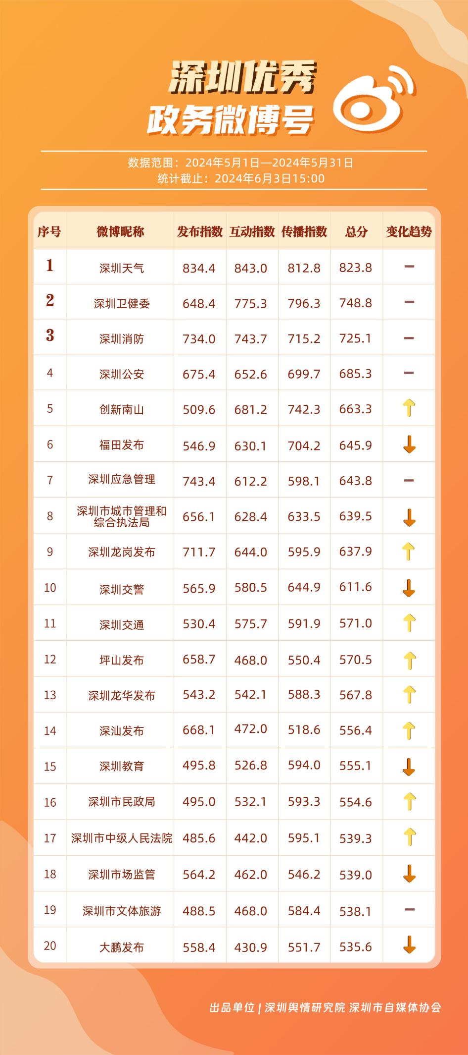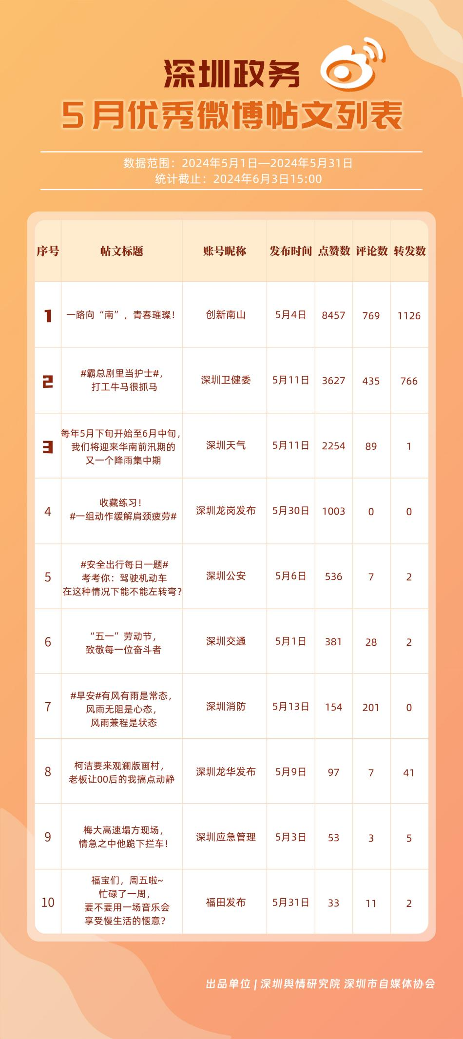 5月,“深圳天氣”“深圳衛(wèi)健委”“深圳消防”“深圳公安”“創(chuàng)新南山”“福田發(fā)布”“深圳應(yīng)急管理”“深圳市城市管理和綜合執(zhí)法局”“深圳龍崗發(fā)布”“深圳交警”等20個(gè)政務(wù)微博號(hào)入列“優(yōu)秀”名單。對(duì)比上期來看,“深圳天氣”“深圳衛(wèi)健委”“深圳消防”“深圳公安”發(fā)揮穩(wěn)定,能夠合理利用微博傳播渠道,持續(xù)輸出受眾喜聞樂見的高質(zhì)量?jī)?nèi)容,“創(chuàng)新南山”“深圳龍崗發(fā)布”等微博號(hào)則在5月發(fā)力宣傳,整體傳播效果有所提升,收獲網(wǎng)民好評(píng)。