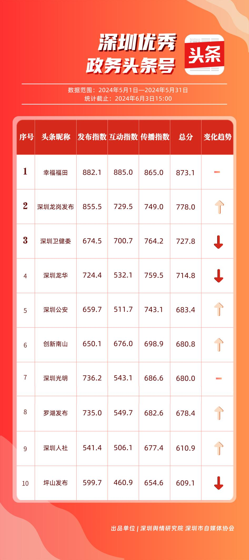 5月,“幸福福田”“深圳龍崗發(fā)布”“深圳衛(wèi)健委”“深圳龍華”“深圳公安”“創(chuàng)新南山”“深圳光明”“羅湖發(fā)布”“深圳人社”“坪山發(fā)布”共10個(gè)政務(wù)頭條號(hào)能夠及時(shí)發(fā)布政務(wù)信息及公共服務(wù)信息,服務(wù)經(jīng)濟(jì)社會(huì)發(fā)展,滿足公眾信息需求,位列“優(yōu)秀政務(wù)頭條號(hào)”榜單,《廣東人將挑戰(zhàn)暴雨上班30天》《幫朋友問:“口~”會(huì)不會(huì)傳染艾滋???》等優(yōu)秀文章資訊深入人心。其他未上榜單位應(yīng)積極運(yùn)用該新媒體平臺(tái)助力政務(wù)公開,讓權(quán)威聲音有效傳播到目標(biāo)受眾,更好地服務(wù)人民群眾。