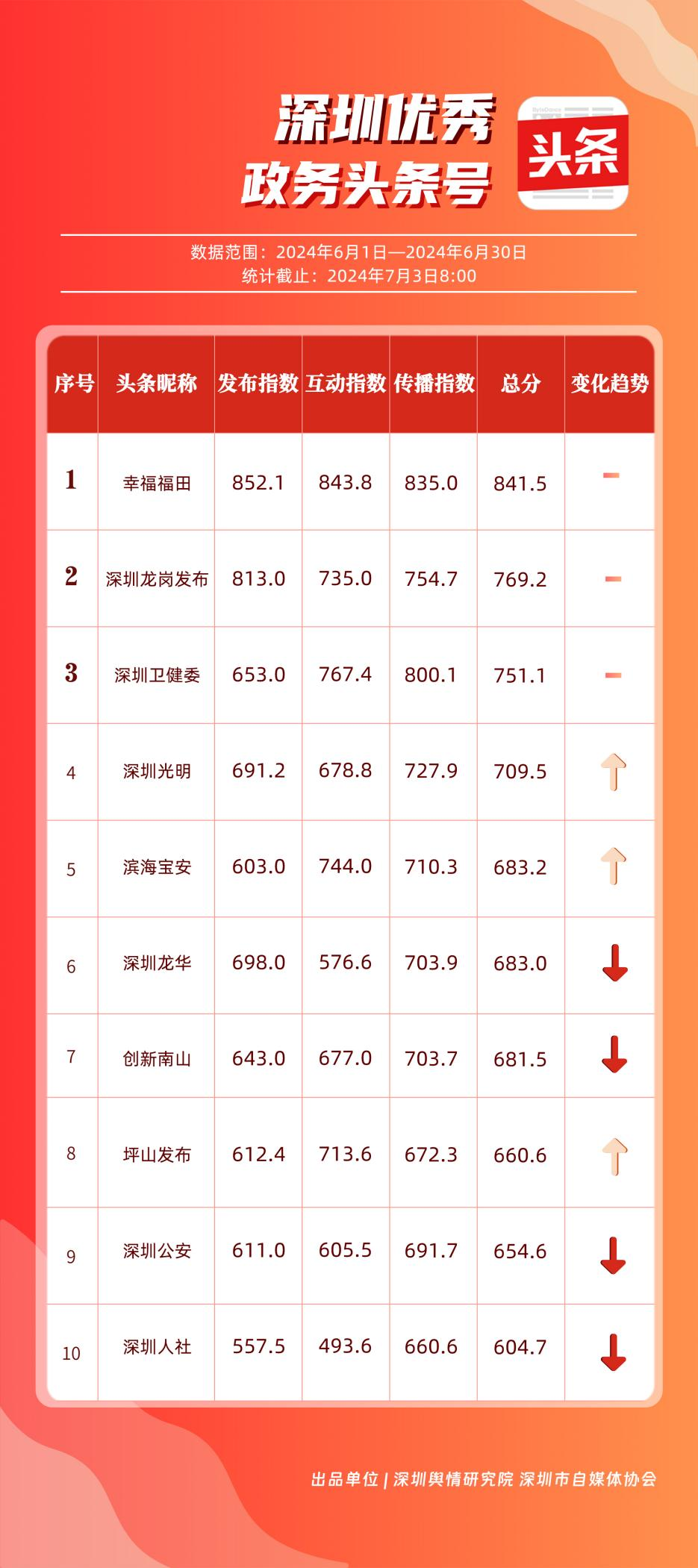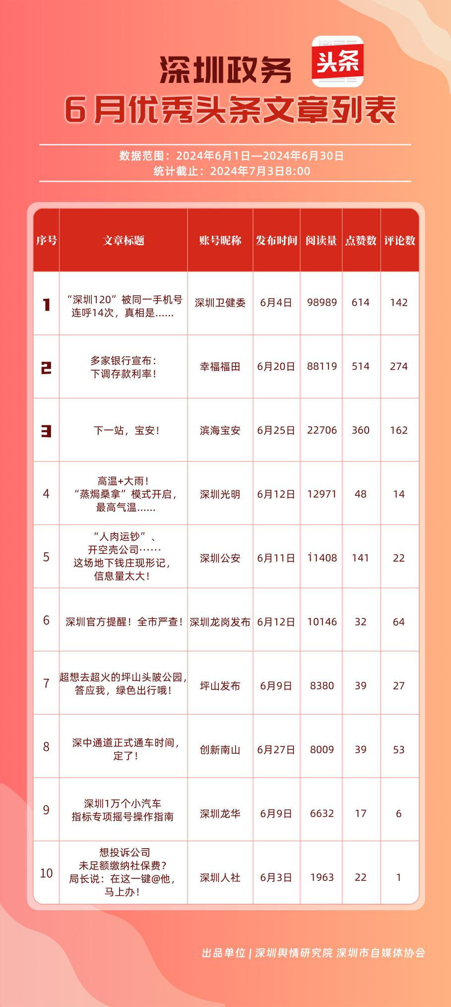 6月,“幸福福田”“深圳龍崗發(fā)布”“深圳衛(wèi)健委”“深圳光明”“濱海寶安”“深圳龍華”“創(chuàng)新南山”“坪山發(fā)布”“深圳公安”“深圳人社”共10個政務(wù)頭條號能夠及時發(fā)布政務(wù)信息及公共服務(wù)信息,入列“優(yōu)秀政務(wù)頭條號”榜單。從數(shù)據(jù)上分析,《“深圳120”被同一手機(jī)號連呼14次,真相是……》《多家銀行宣布:下調(diào)存款利率!》《下一站,寶安!》等優(yōu)秀文章為網(wǎng)民提供醫(yī)療急救、經(jīng)濟(jì)政策、區(qū)域發(fā)展等領(lǐng)域的信息,發(fā)揮各自賬號在信息傳播、公共服務(wù)等方面的重要功能,收獲較高點贊。
