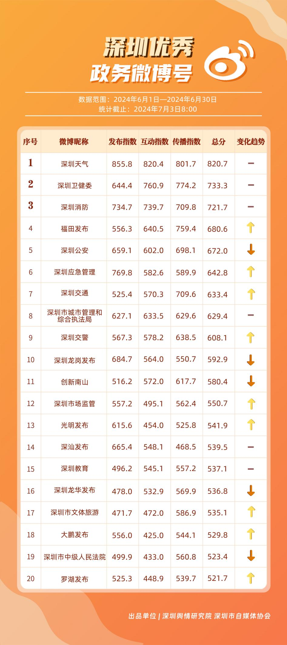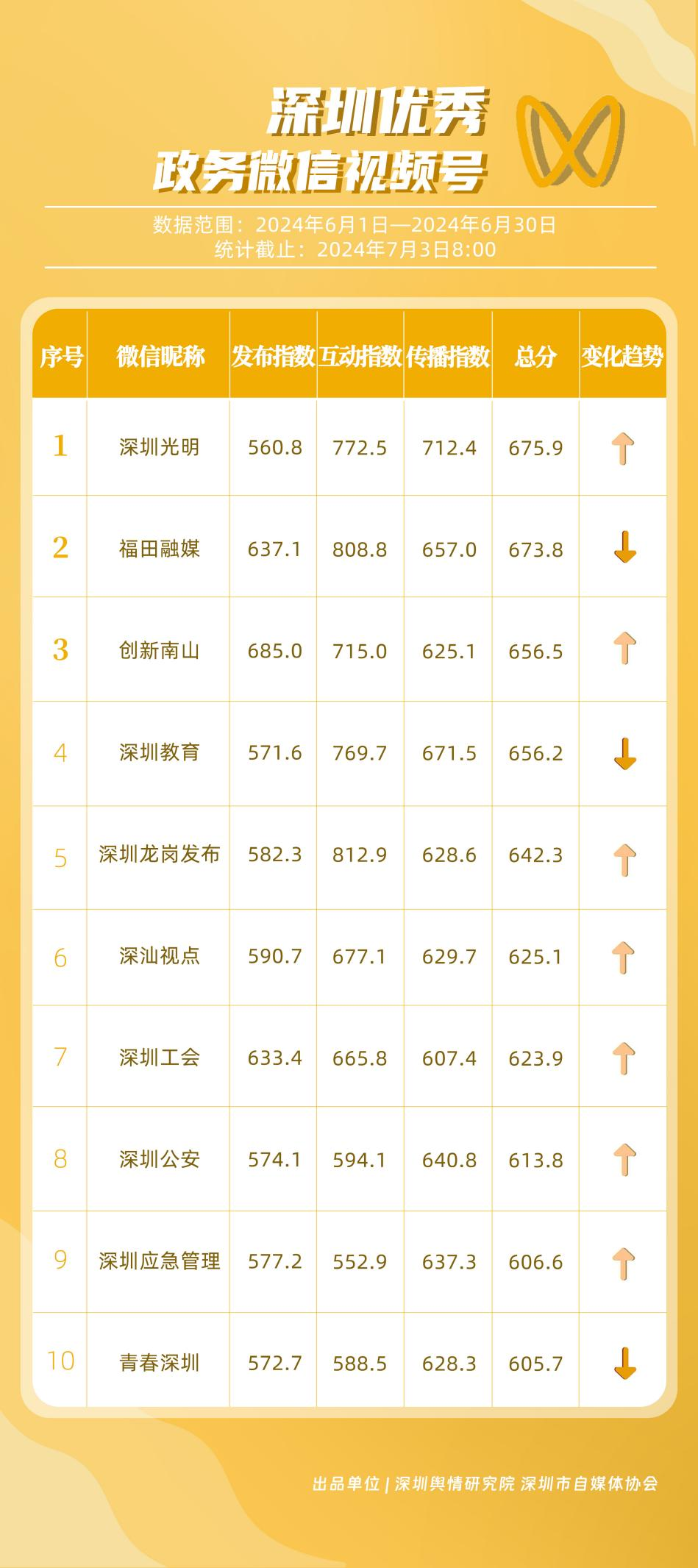 《深圳優(yōu)秀政務(wù)新媒體矩陣》將深圳黨政機(jī)關(guān)、企事業(yè)單位開設(shè)的政務(wù)公眾號(微信)、微博號、抖音號、視頻號(微信)及頭條號按照發(fā)布指數(shù)、互動指數(shù)、傳播指數(shù)三項指標(biāo)進(jìn)行綜合評價,最終形成優(yōu)秀名單。