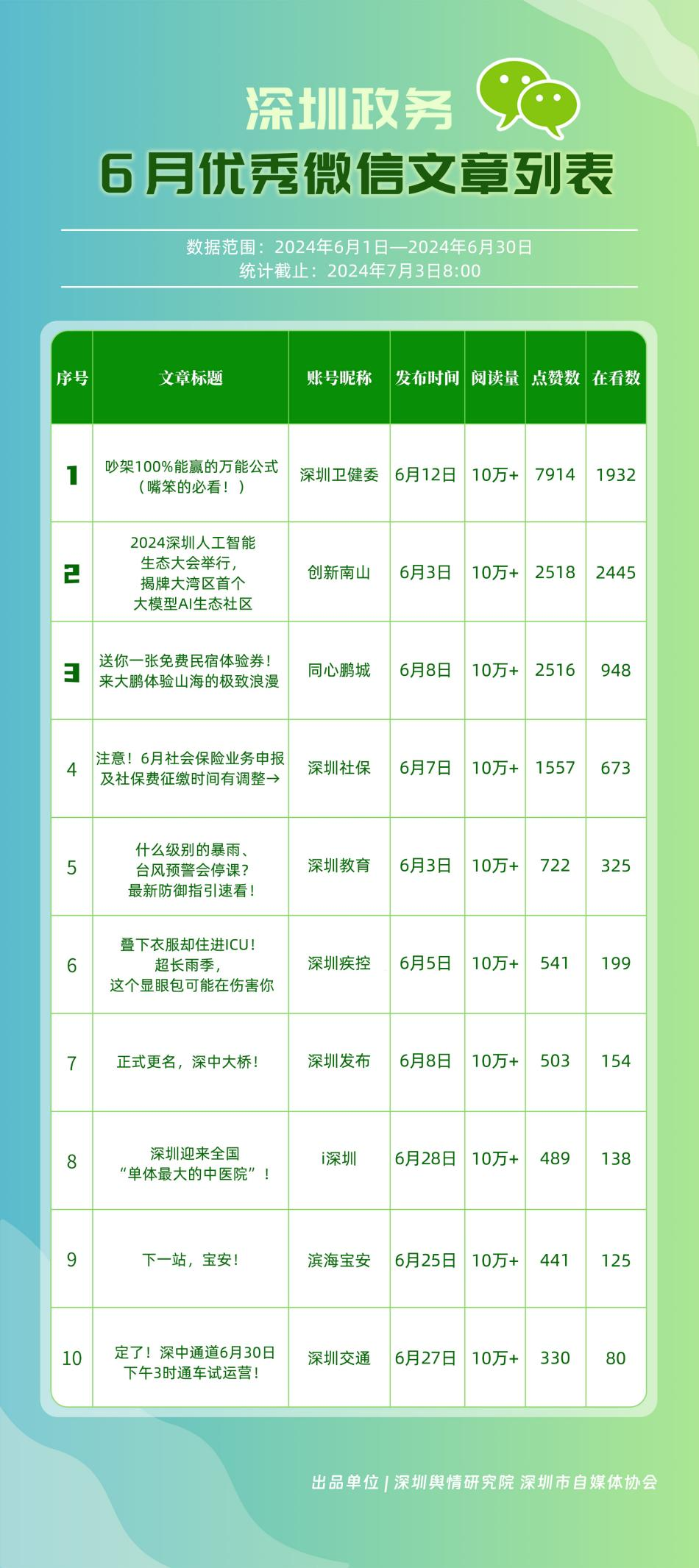 6月,“深圳衛(wèi)健委”“i深圳”“深圳龍崗發(fā)布”“幸福福田”“深圳交通”“深圳教育”“濱海寶安”“創(chuàng)新南山”“深圳工會”“青春深圳”“同心鵬城”“深圳光明”等30個政務(wù)微信公眾號,被評為“深圳優(yōu)秀政務(wù)微信公眾號”。6月,“深圳衛(wèi)健委”因內(nèi)容策劃出色、受眾互動活躍、作品火熱“出圈”等,榮登排行榜首位?!皠?chuàng)新南山”“同心鵬城”“深圳社?!薄吧钲诮逃钡壬习窆娞栆卜e極創(chuàng)作優(yōu)質(zhì)作品,抓住時下熱點趨勢,集中發(fā)揮政務(wù)媒體傳播力量,推動了政務(wù)信息傳播工作提質(zhì)增效。