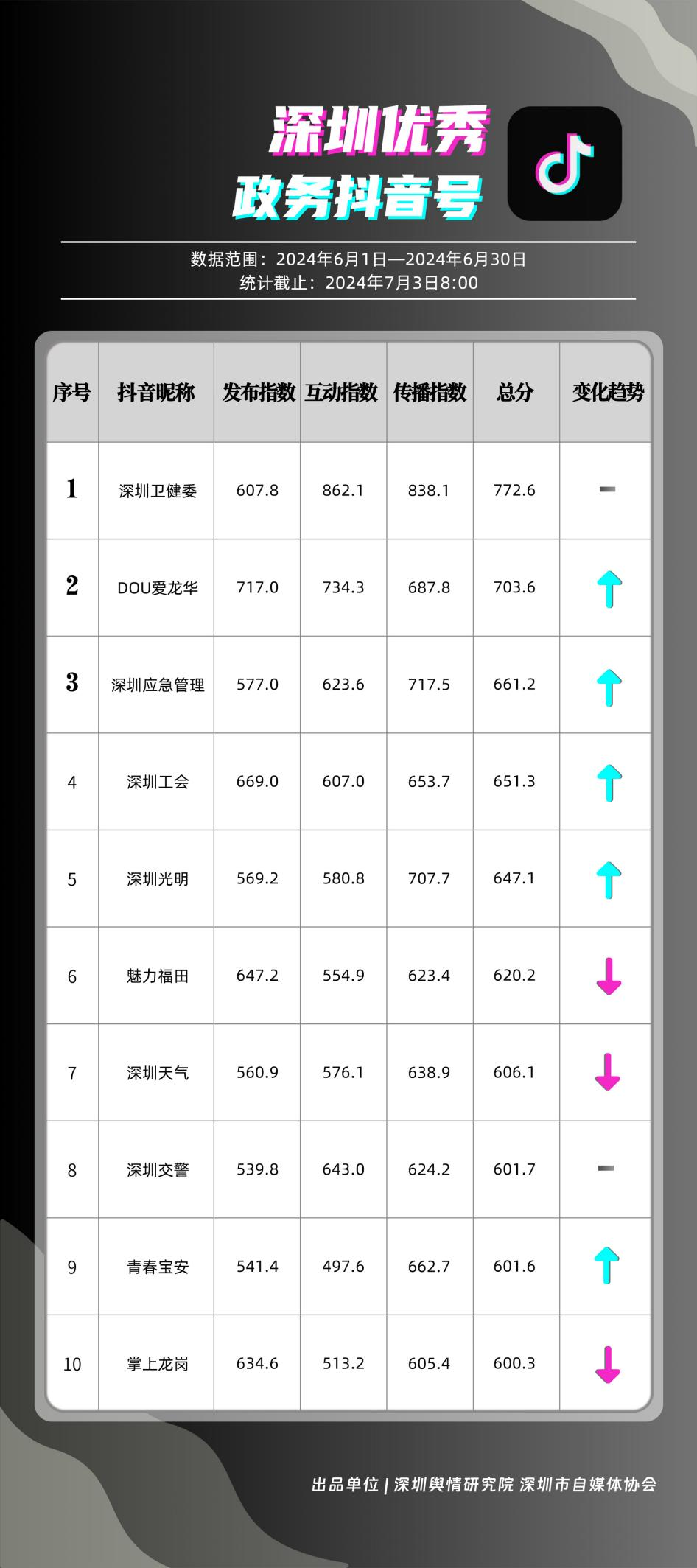 榜單在持續(xù)展示深圳政務(wù)新媒體矩陣建設(shè)成效的同時,梳理總結(jié)了深圳政務(wù)微信公眾號、微信視頻號、微博號、抖音號、頭條號的運(yùn)營方法與經(jīng)驗,是政務(wù)公開、回應(yīng)群眾關(guān)切的重要載體。6月,又有哪些政務(wù)新媒體取得優(yōu)異成績呢?《深圳優(yōu)秀政務(wù)新媒體矩陣》(2024年6月期)邀您共同關(guān)注。