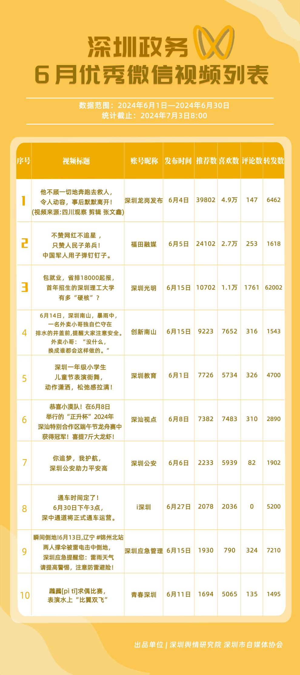 6月,政務(wù)微信視頻號“深圳光明”“福田融媒”“創(chuàng)新南山”“深圳教育”“深圳龍崗發(fā)布”“深汕觀點”“深圳工會”“深圳公安”“深圳應(yīng)急管理”和“青春深圳”榮獲“深圳優(yōu)秀政務(wù)微信視頻號”稱號。結(jié)合整體數(shù)據(jù)來看,6月深圳政務(wù)視頻號平臺推出多條爆款視頻,如《他不顧一切地奔跑去救人,令人動容,事后默默離開!》《不贊網(wǎng)紅不追星,只贊人民子弟兵!中國軍人用子彈釘釘子》等作品,收獲了上萬的推薦數(shù)和喜歡數(shù),是政務(wù)信息傳播高效化和正能量傳播機(jī)制的體現(xiàn)。