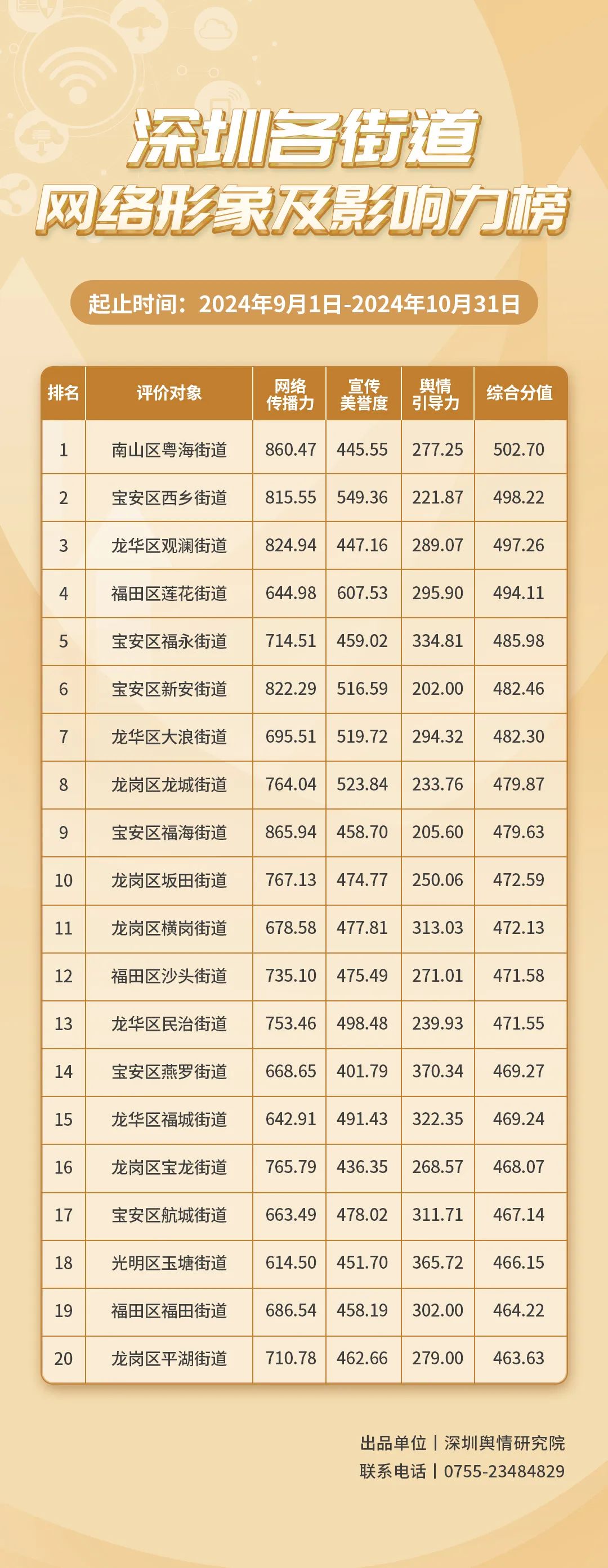 2024年9-10月,各街道不斷探索治理新路徑,力求效能躍升,《深圳各街道網(wǎng)絡(luò)形象及影響力榜》為您揭曉哪些街道網(wǎng)絡(luò)形象治理實效顯著,成標桿,本期榜單數(shù)據(jù)統(tǒng)計范圍為2024年9月1日至10月31日。