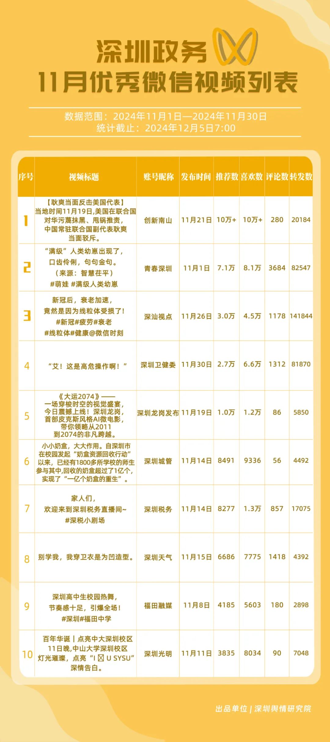 11月,獲“深圳優(yōu)秀政務(wù)微信視頻號(hào)”稱(chēng)號(hào)的分別是“深汕視點(diǎn)”“青春深圳”“深圳衛(wèi)健委”“創(chuàng)新南山”“深圳龍崗發(fā)布”“福田融媒”“深圳教育”“深圳天氣”“深圳稅務(wù)”“深圳光明”。其中,“深汕視點(diǎn)”與“青春深圳”通過(guò)積極轉(zhuǎn)發(fā)涵蓋廣泛領(lǐng)域的優(yōu)質(zhì)視頻內(nèi)容,贏得了網(wǎng)民的廣泛點(diǎn)贊與推薦,彰顯了其在內(nèi)容聚合與傳播上的獨(dú)到之處?!吧钲谛l(wèi)健委”則專(zhuān)注于衛(wèi)生健康領(lǐng)域,發(fā)布了一系列高質(zhì)量的內(nèi)容,深受網(wǎng)民喜愛(ài),進(jìn)一步鞏固了其在健康傳播領(lǐng)域的領(lǐng)先地位。